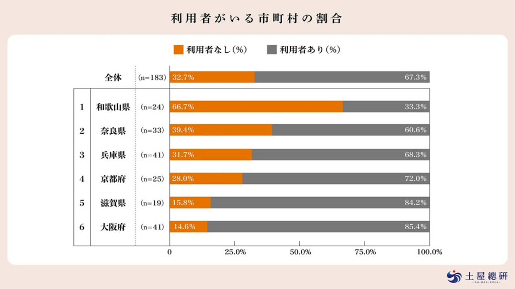 大阪府や滋賀県は市区町村の8割超で利用されており、和歌山県の2.6倍に上ります。
